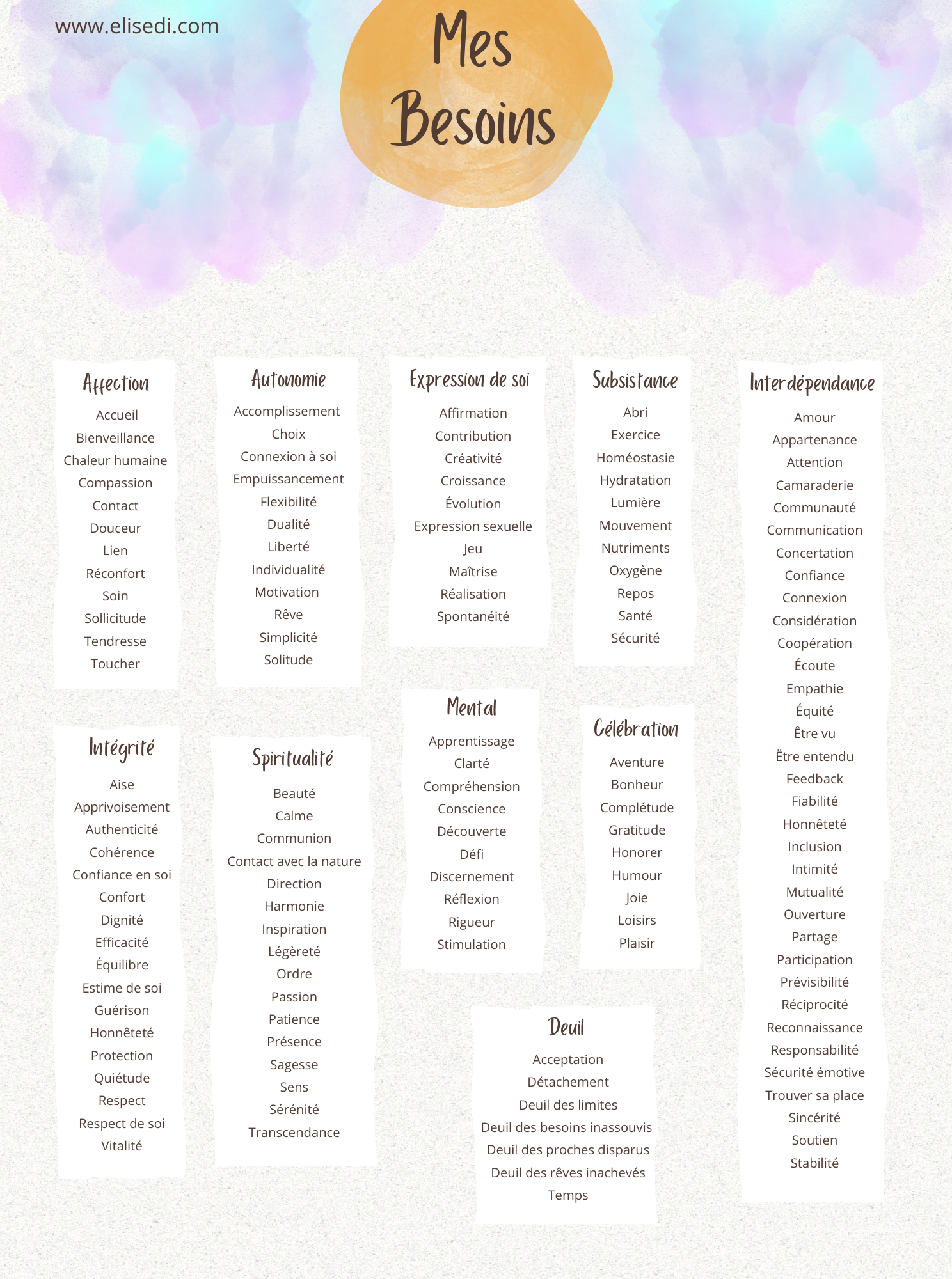 Voici une liste exhaustive des besoins, proposée par l’approche de Marshall B. Rosenberg : la Communication Non-Violente.